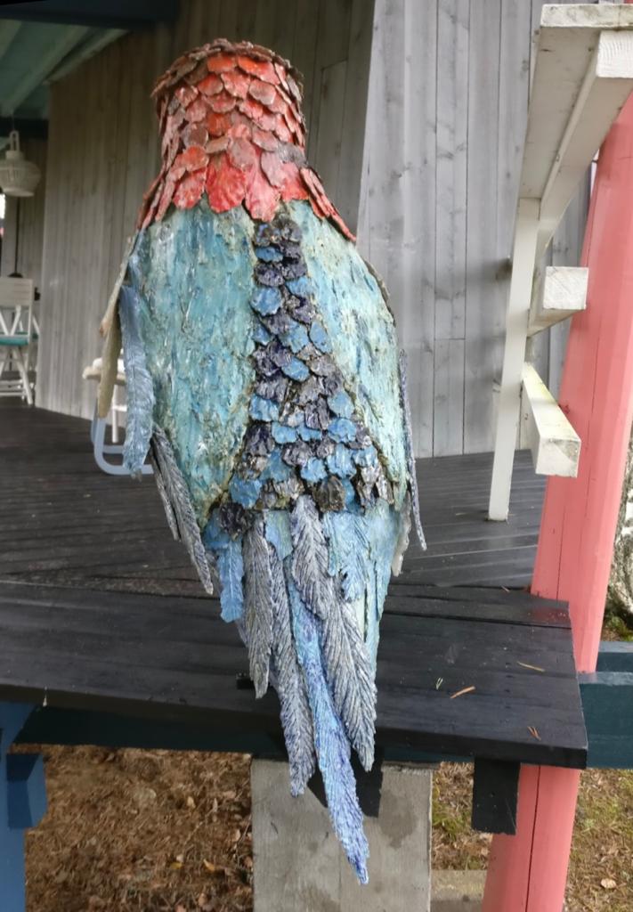 Arvaatko, mikä on vaikkapa sinisen ympyrälogon tarina? No sehän on tietysti jätekaivon kansi, joka syntyi yhteensattumien tuloksena. Mökillä oli ruma kirkkaansininen muovitynnyristä leikattu jätekaivon kansi. Kun papukaijan sulkia jäi ylitse, niille löytyi hyödyllistä käyttöä. Simsalabim.